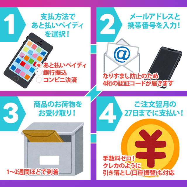 - あと払いペイディは、メールアドレスと携帯番号があれば、スマホひとつで今すぐご注文ができ、翌月にまとめて支払いできる便利な決済サービスです。